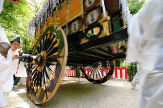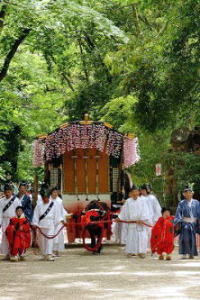 日本三代勅祭(葵祭、石清水祭、春日祭)、京都三大祭(葵祭、祇園祭、時代祭)の一つである賀茂祭(葵祭)は、賀茂別雷神社(上賀茂神社)と賀茂御祖神社(下鴨神社)の例祭で、毎年5月15日(近代以前は4月吉日・第二の酉の日)に行われている。 葵祭は平安時代初期から続く朝廷の行事であり、宮中の祭。祭りは、神幸列ではなく、天皇の使者・勅使が下鴨神社(下社)、上賀茂両神社(上社)への参向が特徴となっている。 ◆フタバアオイ・桂 祭りの当日、参加者の挿頭(かざし)、社殿などを葵の葉(二葉葵、ウマノスズクサ科の多年草)と桂で飾る。この威儀物(いぎもの)としての二葉葵と桂を御葵桂(おんきっけい)ともいう。 葵については、御神託により「吾に逢いたければ葵を飾り、祭りをして待てば地上に降りよう」(『賀茂日記』)とあるという。神武天皇の先導をした賀茂建角身命(かもたけつぬみのみこと)の娘・玉依比売(たまよりひめ、玉依日売)は、丹塗矢となって瀬見の小川を流れ下った火雷神(ほのいかづちのかみ)との間に、賀茂別雷命(かもわけいかづちのみこと)を産む。玉依比売は、成長した賀茂別雷命に父は誰かと問うと、「天の神」と答え、雷鳴響き、天上へと上っていった。子に会いたいと思う玉依比売の夢に、賀茂別雷命が現れる。葵楓(あおいかつら)の蔓をつくり、祭事に飾って待てば現れる」と告げる。その通りに営むと、神山(こうやま)に賀茂別雷命が降臨し、再会を果たしたという。以来、葵祭(賀茂祭)にカツラ、フタバアオイの飾りを身につけるようになったという。葵の語源「あふひ」も、わが子に会いたいと願ったこの玉依比売命の神話に由来しているという。 また、別雷神が生まれたという御形山(御蔭山)に、二葉の葵が生じた故事によるともいう。葵には雷と地震の厄除けにもなるともいう。葵は女性、桂は男性を象徴し、二つの植物が一つになることにより、神の御生(みあ)れを祈るともいう。また、両性和合・子孫繁栄との俗信もある。 下鴨神社では、神紋二葉葵は、古くは「あふひ」と呼ばれ、「あふ」は「会う」、「ひ」は神の力を表し、「神の力にあうこと」を意味していると伝えられている。なお、松尾大社もまた、同じ葵と桂の神紋を用いており、賀茂社との関わりがあるともいわれている。 葵紋(三つ葉葵)の徳川家は、室町時代後期、応仁・文明の乱(1467-1477)後、途絶えていた祭礼の復興のために祭料の支援を行なった。このため葵祭と呼ばれるようになったという説もある。江戸時代前期、1610年より、上賀茂神社では、徳川将軍にフタバアオイを献上していたいい、江戸時代後期、1867年に途絶えていたが、現代、2007年より復活した。 ◆祭儀 賀茂の祭祀は、賀茂県主によって執り行われていた。 祭の前儀として、「流鏑馬神事」「斎王代御禊の儀」「歩射神事」「御蔭祭」などさまざまな儀式が繰り広げられる。当日の祭儀は、「宮中の儀」「路頭の儀」「社頭の儀」の三つからなっている。「社頭の儀」は、斎王代が両社に参り、進物を神前に捧げる幣帛(へいはく)、「奉幣の儀」のことをいう。勅使役が祭文と幣物を受け取る「宮中の儀」はいまは行われていない。 出発地の御所で、列立・進発の儀が執り行われ、「路頭の儀」となる。路頭の儀は、斎王代を初めとする一行が、御所から下鴨神社を経て上賀茂神社に向かう祭列をいう。 王朝装束を身にまとった総勢約500人、牛馬40頭の行列が進む。約1kmにもなる行列は、京都御所の建礼門を午前10時半に出発し、下鴨神社(正午前)を経て、午後、鴨川の上流を目指し賀茂街道を北上し、上賀茂神社(午後3時半頃)へと到る。現在の列は、鴨川を三度渡る。出町橋、北大路橋、最後は御薗橋を渡って上賀茂神社に到着している。行列は5列からなり、先頭を切る警護列、幣物列、走馬列、勅使列、斎王列と続く。行列の中心は勅使列の勅使役・近衛使となっている。騎馬、牛車、風流傘、女人列、腰輿(およよ)など、それぞれ王朝絵巻に彩りをそえている。 ◆歴史 祭りは、古くは「賀茂祭」「みあれ」「北の祭」、または単に「祭」とも呼ばれた。祭りは、四月の中の午後の日に行なわれていた。賀茂県主家を中心とした賀茂氏の豊作祈願のための祭りだったとも見られている。 飛鳥時代、欽明天皇(539-571)の頃、544年(567年とも)に、天候不順で五穀が実らず、農漁業の不作と不漁、飢饉が続き疫病が流行した。卜部伊吉若日子(うらべのいきわかひこ)が占ったところ、賀茂大神の祟りのためとされ、これを鎮めるために行われるようになったという。4月、馬に鈴をつけ猪頭を被った人が馬を駈けると豊年となり、以後乗馬が始められたという。(『秦氏本系帳』『日本書紀』『賀茂縁起』) また、上賀茂神社には、別雷神が神山に降臨した際に、神託により、奥山の賢木(さかき)を取り、阿礼(あれ)に立て、綵色(いろあや)を飾り、走馬、葵楓(あおいかつら)の鬘(かずら)を装い、祭りを行ったことに起源があるという。(『賀茂旧記』) また、天皇は