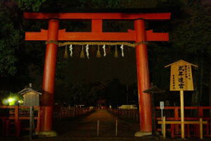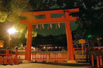 ![]() 当日の上賀茂神社一ノ鳥居 ![]() 当日の二ノ鳥居、午後8時前、松明の火を先頭に、20人ほどの神職が二の鳥居をくぐり、闇の中に消えていった。 |