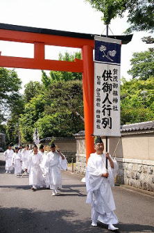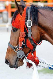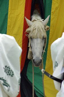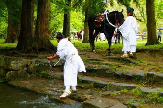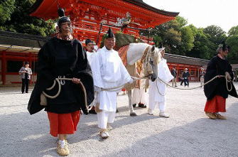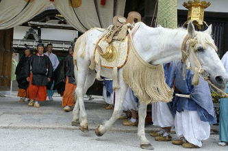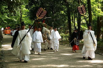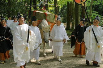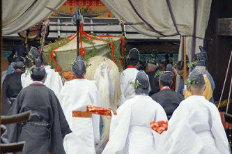 ![]() 神霊櫃を乗せた神馬、幣殿へ奉牽、神馬は御生綱により引かれている。下鴨神社 |
