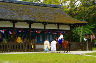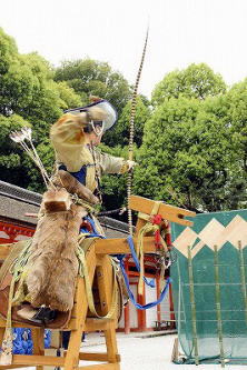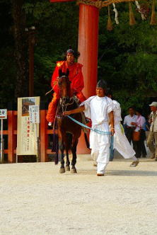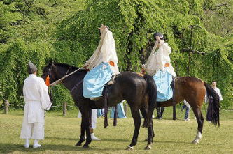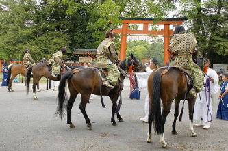 流鏑馬神事は、葵祭に先立ち、祭りが平穏無事に行われるように、道中を祓い清める意味がある。 流鏑馬神事(やぶさめしんじ)の流鏑馬とは、馬を走らせながら、弓を放つと音がする矢鏑矢(かぶらや)を射ることによる。流鏑馬は「やぶさめ」、「やぼさめ」とも読まれ、「矢伏射馬」とも書かれた。流鏑馬と呼ばれるようになったのは、平安時代から鎌倉時代の後鳥羽上皇による当社への御幸以来ともいう。ただ、近代以前、下社では、「騎射(きしゃ)」と呼んでいた。 騎射の技は、『日本書紀』(457)に古墳時代に「騁射(うまゆみ)」、飛鳥時代、「馬的射(むなまと)」(682)の記述があるという。なお、糺の森からは、古墳時代の馬具が出土している。698年には、賀茂祭での騎射が禁じられたとの記述がある。(『続日本紀』)また、平安時代後期(1096頃)に始まったともいう。騎射の武術は、鎌倉時代には武家社会で盛んに行なわれていた。 騎射も過去には幾度が中断している。室町時代、1502年の中断後、江戸時代、1694年に再興される。近代以降、東京遷都にともない、1869年に中断後、1973年の式年遷宮奉祝行事以降に「流鏑馬神事」として復活し、1976年からは恒例化した。 当日は、糺(たたず)の森に設けられた馬場(全長約500m)で、馬を走らせながら騎手が三つの的をめがけて弓を射る。的は、約100m間隔で置かれ、約50cm四方の杉板で、菱形に置かれ、これを連続して射ぬいていく。この際に、騎手は「インヨー」(陰陽)と掛け声を発し、矢を放す。 最初の三馳の射手は、いまも騎射といわれ、水干(すいかん)に綾蘭笠(あやいがさ)の公家装束をし、武家の狩装束を着ける。弓馬術は、弓馬術礼法・小笠原流一門によって行なわれている。 矢が当たれば豊作、所願成就、打ち抜いた的板は縁起もので、当たり的として授与されている。 |
