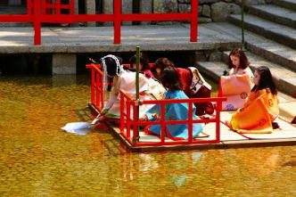![]() 御禊の儀、御手洗池(下社)、下鴨神社では、境内の御手洗(みたらし)池で水に手を浸して身を清める御禊(みそぎ)を行う。 ![]() 下社 |