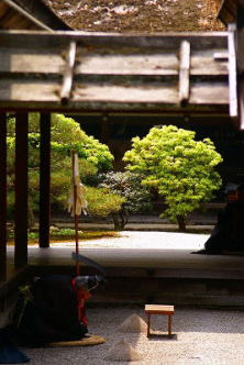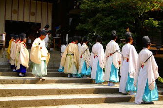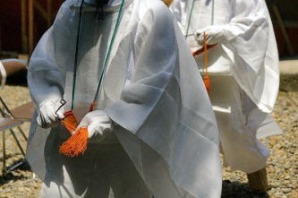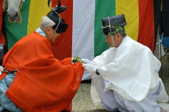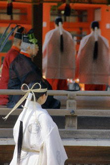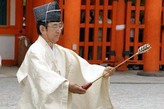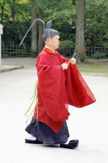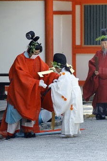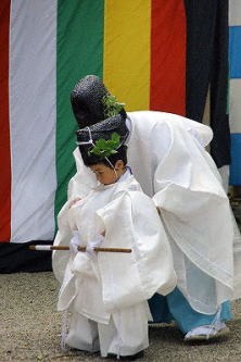 ![]() 下鴨神社、白杖が氏人から童形に手渡される。杖は、進む方向わ表すという。 |