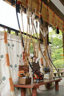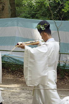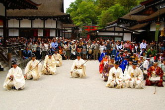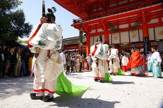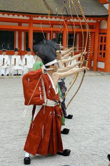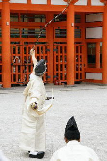 宮中の古式にのっとって行なわれる歩射神事(ぶしゃしんじ)も、葵祭に先立ち、沿道の邪気を祓い、祭りの安全祈願する意味がある。 神事は、平安時代に宮中で行われていた「射礼(じゃらい)の儀」が始まりともいう。馬上で行なわれる流鏑馬に対し、地上で矢を射ることに由来する。 儀式は小笠原流によって行われ、四つの式があり、「鳴玄蟇目神事(めいげんひきめしんじ)」と呼ばれる。 直垂(ひたたれ)姿の射手が弓の弦を鳴らし、天地四方の邪気を払う蟇目(ひきめ)式。次に、楼門の屋根を矢を射て越えさせる屋越(やごし)式。斎庭の大きな的を射る大的(おおまと)式、射手が横に並び、連続的に矢を放っていく百々手(ももて)式がある。 |