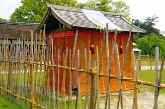 ![]() 御蔭神社、御蔭山の儀、かつて社殿がなかった時代には、樹木により囲い、「芝挿(しばさし)」(清浄地)とした。本殿の御簾には葵と桂が飾られている。 |