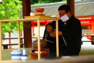 ![]() 武者小路千家家元による献茶の奉仕、下社 |