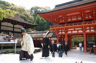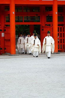 ![]() 御蔭神社、刀禰(とね)といわれる門番が本殿の両脇に控える。世襲制で、カモ一族とのかかわりの深い人々による。 |