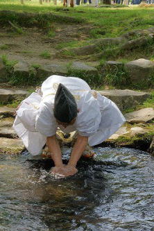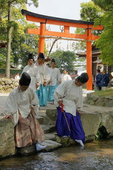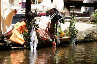 ![]() 最後に、下社では祓串(いぐし)を、上社では人形(ひとがた)を 川に流し穢れを清める。 |
