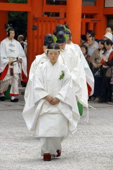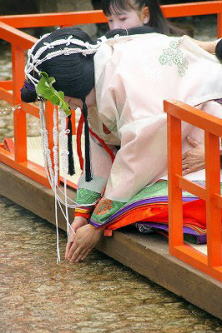 斎王代御禊の儀(さいおうだいみそぎのぎ)は、毎年、上社と下社で隔年で行われている。 十二単の斎王代は、祝詞、お祓いの後、御手洗池(下社)か、ならの小川(上社)に両手をひたし身を清める儀式をいう。下社では祓串(いぐし)を、上社では人形(ひとがた)を川に流して穢れを清める。 斎王代の両脇には、童女が仕える。また、葵祭の路頭の儀の女人列に参列する約40人の女性の身も清める。 かつて御禊の儀は、鴨川で行われていた。両社の境内を流れる川は、いまも鴨川の源流の一つとなっている。鎌倉時代前期に斎院の廃止と共に中断した。その後、1956年の斎王列復活とともに行われるようになった。 もとは斎王といい、平安朝時代以来、未婚の内親王が選ばれて奉仕していた。現在は、斎王の代理という意味の斎王代が、京都市在住の未婚女性から選ばれている。 |
