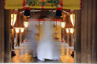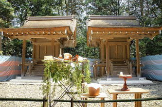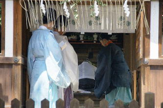 ![]() 御生(みあれ)神事、神饌は下げられ、荒御魂(あらみたま)の降臨を待つ。御蔭神社 |
