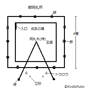 上賀茂神社の祭祀の中では、最も古く重要な神事になる。葵祭に先立ち、夜半に闇の中で神職のみで行なわれる。非公開になっている。 神事の斎場は、上社の北西にある丸山の南麓「御阿礼所(みあれところ、御生所)」に、神籬(ひもろぎ)の囲いがつくられる。かつてはさらに北の神山(こうやま)で行なわれていた。この神域は、松杭を6尺(1.8m)の高さに立て、杉の横木3段に組み、松、桧、柳、金木などを差し込み覆う。前面外側は葵桂(1間半)を3組付けて御囲いにする。 御阿礼所の中央には、榊に垂の「阿礼木」が立てられ、南に松の丸太2本の「御休間木(おやまぎ)」が扇形に突き出している。さらに2つの立砂(たてすな)に榊を立てる。 さまざまな御阿礼神事は宮司、矢刀禰(やとね)などによって行なわれ、さらに本殿に場所を移される。本殿内陣には御帳台(みちょうだい)に「勧請の小麻」(かんじょうのこぬき、阿礼棒)がある。 この夜、みあれ(生[あ]れ、再生)した神霊(別雷神)は、御阿礼所の御阿礼木、御休間木から、矢刀禰の真榊を経て、本殿小麻に移され、賀茂祭当日を迎える。 |