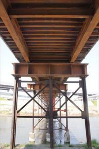 ■39 竹田橋(たけだ-はし)✓ 小さな人道橋の鉄橋。 ◈所在地:〒612-8415 京都市伏見区竹田中島町 ◈路線名: 竹田経40-1号線 ◈架設年: 1980年3月 ◈橋種: 鋼橋/15径間単純鋼プレートガーター ◈橋長: 103.65m/104m ◈幅員: 3.3m/3.9m ◈隣橋(下覧)との河心距離: 155m |