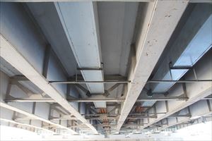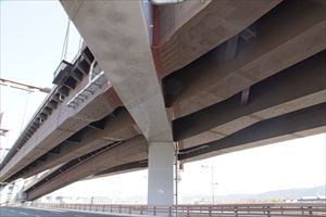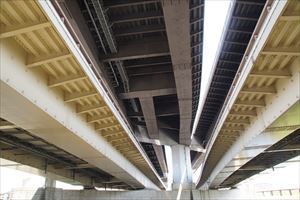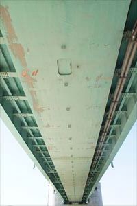 ■44 鴨川大橋(名神高速道路橋)(かもがわ-おおはし)✓ 名神高速道路が通じている。 ◈所在地:京都市 ◈路線名: 名神高速道路 ◈架設年:1960年 ◈橋種:鋼単純合成鈑桁橋 ◈橋長:202.6m ◈幅員:14.5m ◈隣橋(下覧)との河心距離:170m |