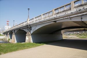 ■43 鳥羽大橋(とば-おおはし) ✓ 親柱が独特。 ◈所在地:〒601-8144 京都市南区上鳥羽火打形町 ◈路線名: 国道一号線 ◈架設年:1932年 ◈橋種:6径間連続RCアーチ橋 ◈橋長:116.2m ◈幅員:18m ◈隣橋(下覧)との河心距離:435m ![]() |