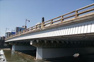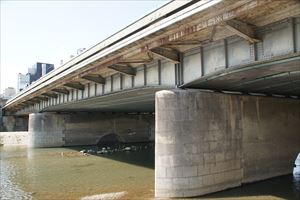 ■26 正面橋(-) 豊国神社、方広寺の正面に当たる橋。 ◈所在地:〒605-0909 京都市東山区鍵屋町 ◈路線名: 正面通 ◈架設年:1952年 ◈橋種:鋼橋3径間連続鋼プレートガーター ◈橋長:71.15m/71m ◈幅員:5.82m/7.0m ◈隣橋(下覧)との河心距離:270m ⇒正面橋 |