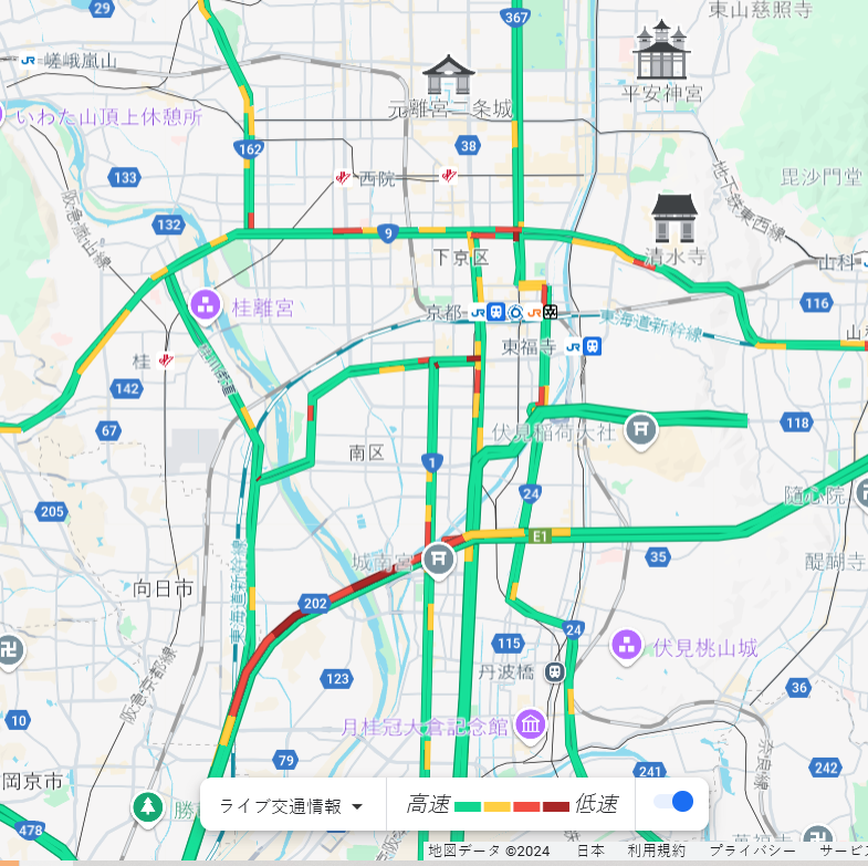 下の地図上でクリックしGoogle Mapに入ってください 。リアルタイムで京都市内の交通の混雑状況が確認できます。↓