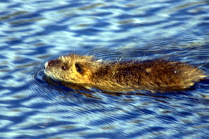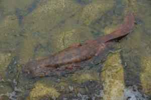 出雲路橋上流、オオサンショウウオ、ただし中国産との交雑種らしい。体長約1m。 (2012.6) |