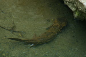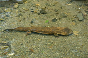 鴨川上流某所、鴨川固有種?のニホンサンショウウオ。生きた化石と呼ばれている。水中をゆっくりと移動していた。 |