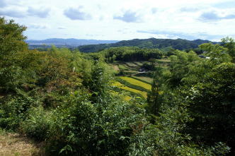 ![]() 山頂からの棚田の風景。現在、このすぐ近くで高速自動車道の建設が進められている。 |