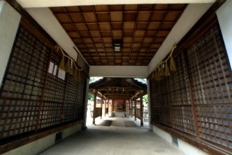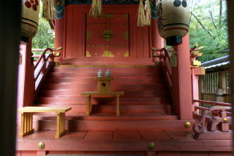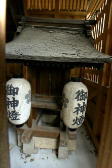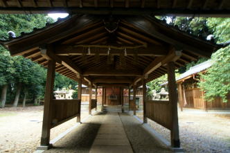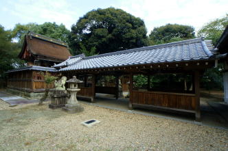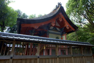 ◈「本殿」(京都府登録有形文化財)は、江戸時代初期建立による。組物は、三斗組中備(なかぞなえ、三斗間に入れるもの)として四面に蟇股。木鼻、懸魚が見られる。妻飾りは松、梅など。狛犬、狛獅子の極彩色の画が描かれている。たち高い一間神流造、檜皮葺。