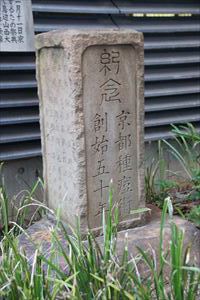 京都府医師会館の前庭内に、「京都種痘術創始五十年紀念碑(きょうと-しゅとうじゅつ-そうし-ごじゅうねんきねん-ひ)が立てられている。碑には「京都種痘術紀念創始五十年」と刻まれている。 ◆歴史年表 江戸時代、弘化年間(1844-1848)、京都で痘瘡が流行した。 1849年、9月、鼎哉は牛痘法の早期導入を進め、長崎から痘苗を取り寄せた。孫に接種し効力を確認した。京都で牛痘法による種痘が試みられた最初になる。10月、日野除痘館(中京区新町三条下ル頭町)を開設した。 1850年、5月24日、鼎哉が亡くなり、西大谷墓地(東山区)に葬られる。 近代、1898年、11月11日、大徳寺(北区)で種痘創始50年記念祭を行う。西大谷墓地の鼎哉の墓前で法要が行われ、祭典執行発起人有志の29人により碑が立てられた。 現代、1950年、種痘伝来100年記念事業として、京都府医師会が鼎哉の墓石を再建した。碑は京都府医師会館内(上京区丸太町通智恵光院東入)に移設される。 1966年、医師会館(中京区壬生高田町)が再移転し、碑も新会館内に移設される。 2010年、10月、医師会館(中京区西ノ京栂尾町)の再々移転にともない、新会館内中庭に移設された。 ◆日野鼎哉 江戸時代後期の蘭方医・日野鼎哉(ひの-ていさい、1797-1850)。号は暁碧、蔭香。豊後国(大分県)生まれ。郷里で儒者・理学者・帆足万里(ほあし-ばんり)に師事した。1824年、長崎に行き、医者・博物学者・シーボルトにオランダ医学を学んだ。1833年、京都で開業(東洞院通蛸薬師下ル)している。1849年、長崎のオランダ商館医・モーニケが牛痘苗の接種に成功し、鼎哉はその痘苗(モーニケ苗)を入手する。京都で孫らに接種して植え継ぐことに成功した。同年、日野除痘館(中京区新町三条下ル頭町)を開き、牛痘接種を行う。京都で牛痘法による種痘が試みられた最初になる。著『白神(ワクチン)除痘弁』。54歳。 日野の植え継いだ痘苗は門人・笠原良策により福井、緒方洪庵(おがた-こうあん)により大坂に分苗され、それぞれ普及された。 大谷墓地(東山区)に葬られた。 ◆笠原良策 江戸時代後期-近代の医師・笠原良策(かさはら-りょうさく、1809-1880)。諱は良、字は子馬、号が白翁。越前国(福井県)生まれ。1829年、江戸で徳本流 (医師・永田徳本) の伝承者になる。古医方・磯野公道の塾に入門した。後、大武了玄に蘭学を学ぶ。京都の日野鼎哉に蘭方を学ぶ。1845 年、牛痘接種の必要を知り、藩主・松平春嶽に牛痘苗の輸入を上申した。1849 年、鼎哉が植え継いだ痘苗の一部を譲り受け福井に運び、北陸で種痘を実施した。71歳。 ◆牛痘接種 1796年にイギリス人医師・エドワード.ジェンナー(1749-1823)が牛痘接種に成功した。 江戸時代、1823年にドイツの医者・博物学者フィリップ.フランツ.フォン.シーボルト(1796-1866)は、牛痘苗を持参し来日した。長崎「鳴滝塾」の門人を集め、牛痘接種が行われた。ただ、痘漿(とうそう、痘瘡の水疱から出る膿汁)は、熱のためウイルスで死滅しており接種は成功しなかった。この場に日野鼎哉が居り、接種を見学している。 1849年、佐賀藩医・蘭方医・楢林宗建(ならばやし-そうけん、1802-1852)の進言により、瘡蓋(かさぶた)の形でバタビア(現在のインドネシアの首都ジャカルタ)から輸入される。ドイツ人の蘭館医・オットー.モーニケ(1814-1887)は宗建の子らに接種し、種痘苗(モーニケ苗)は受け継がれた。 1849年9月19日/22日、鼎哉、その門人・笠原良策は、唐通詞・熲川(えかわ)四郎八に種痘苗の輸入を依頼した。7月、四郎八は、長崎で自分の孫に種痘を行い、その瘡蓋を硝子瓶8個に入れて鼎哉に飛脚便で届けている。 鼎哉は、自分の孫・朔太郎、門人・桐山元中の子に接種し、種痘苗を増やした。6日後に真痘と確認され京都初の種痘が成功した。10月16日、鼎哉は除痘館(中京区新町三条下ル頭町)を開設している。鼎哉、良策、桂洲ら22人が属していた。 11月7日に大坂除痘館で分苗式を行っている。鼎哉の弟で医師・日野葛民(大坂道修町)、医学者・蘭学者・緒形洪庵(おがた-こうあん、1810-1863)の要請があった。以後は大坂、関西に分苗された。笠原は痘児2人を連れ、福井に帰り分苗している。 京都の日野除痘館は、経済的な負担などにより開所2カ月後に閉鎖されている。1850年5月に、鼎哉は亡くなった。 ◆碑 京都種痘術創始五十年紀念碑には、祭典執行発起人29人の名が刻まれている。朝臣俊介の書による。 近代、1898年、最初の種痘から50年を記念し、日野鼎哉の西大谷墓前で法要がおこなわれた。現在の碑が、祭典執行発起人有志により立てられている。鼎哉の墓はすでに無縁墓になっており、棹石の部分は失われていた。その台石上に碑が立てられた。 1950年、種痘伝来100年記念事業として、京都府医師会が鼎哉の墓石を再建した。碑は旧京都府医師会館内(上京区丸太町通智恵光院東入)に移設される。その後も2度の医師会館移転に伴い、碑も移されている。 ◆京都医会 近代、1889年に京都医会発起人総会が開催される。1890年9月、設立総会(花見小路歌舞練場)が開か