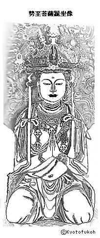 ◈両脇侍の「観音菩薩跪坐(きざ)像」(107/107.6cm)、「勢至菩薩跪坐像」(107/107.3cm)は、室町時代の康知作という。右の観音菩薩は蓮台を捧げ持つ。左の勢至菩薩は合掌する。木造、寄木造、漆箔。光背は後補による。