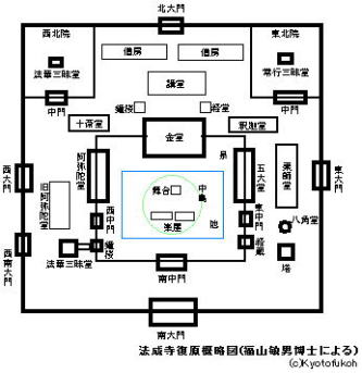 ![]() 平安時代後期、1057年頃の法成寺の復元予想図、東北院は右上隅にある。 ![]() |
