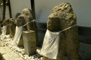周山街道を折れ坂を北へあがると、山腹に大龍寺(だいりゅう-じ、大竜寺)がある。「うっさん」「うっさんの寺」ともいう。かつては花街にあり、女性の病平癒の信仰も篤かった。また、厠の守り神様としても知られている。山号は八部山という。 浄土宗。本尊は阿弥陀如来。 有樞沙摩明王(うすさま-みょうおう)は下半身の健康、乳守地蔵は安産、乳の出がよくなるという信仰篤い。 ◆歴史年表 安土・桃山時代、1586年、京都に疫病が流行した際に、然誉(清善とも)が有樞沙摩明王(うすさま-みょうおう)の法力により建立したという。 江戸時代、1788年、天明の大火により焼失した。 1804年、うすさま堂(中京区裏寺町)は、信者が材木を持ち寄り建立され、花街の信仰を集めた。 現代、1977年、4月、現在地に移転する。 ◆然誉 安土・桃山時代-江戸時代前期の浄土宗の僧・然誉(ねんよ、1556-1623)。男性。俗姓は井上、幼名は童寿丸、字は故信、呑竜(どんりゅう)、太田呑竜(おおた-の-どんりゅう)、号は源蓮社然誉大阿(げんれんしゃ-ねんよ-だいあ)。武蔵国(埼玉県)の生まれ。同国林西寺の岌弁(きゅうべん)に師事し出家した。江戸・増上寺の存応(ぞんのう)に学ぶ。林西寺、大善寺の住職になる。1590年/1613年、徳川家康が上野(こうずけ、群馬県)太田に大光院を建立した。開山第1世として招かれる。一時、孝心のため国禁を犯した子をかくまい寺を追われた。後に帰山を許され、紫衣(しえ)の綸旨(りんし)を賜わる。68歳。 檀林教育、布教に尽くした。貧民の堕胎風潮を憂い、赤子を寺で養育し「子育て呑竜」と呼ばれた。 ◆仏像 本堂安置の「阿弥陀如来像」は、平安時代の最澄(767-822)が、霊夢により都の守護の為、釈迦、弥陀、薬師、大黒、毘沙門天の像を刻み安置したという。その際に、大龍寺に置かれたのが阿弥陀如来だったという。 ◆有樞沙摩明王 うすさま堂に祀られている有樞沙摩明王(うすさま-みょうおう)は秘仏とされている。三目八臂の忿怒相をしている。江戸時代に出開帳仏を勧請し、御前立としたという。厠の守護神であり、下半身の病気、生理痛、旅行などの際に生理を預かるという信仰がある。 有樞沙摩明王は、古代インド神話の炎の神であり、この世の一切の汚れを焼き尽くす功徳を持つという。そのため、便所の清めの霊験があり、また、胎内に宿す女児を男児に変化させる力を持ち、戦国武将の信仰を集めた。 密教の明王としては、人間界と仏の世界を隔てる天界の火生三昧に住し、人間界の煩悩が仏の世界へ及ばないように、火焔により煩悩や欲を焼き尽くす。仏の教えを信じない者に対しては憤怒し、それを目覚めさせるという。 ◆乳守地蔵 うすさま堂隣の乳守地蔵は、安産と乳の出を良くするという信仰がある。 ◆文化財 うすさま堂に、歌舞伎役者・故2代目・中村鴈次郎(1902-1983)奉納の木彫りの河童がある。 *年号は原則として西暦を、近代以前の月日は旧暦を使用しています。 *参考文献・資料 『京都のお寺神社 謎とき散歩』、『昭和京都名所図会 4 洛西』、『京都のご利益手帖』、ウェブサイト「コトバンク」 ![]() ![]() ![]() ![]() ![]() |