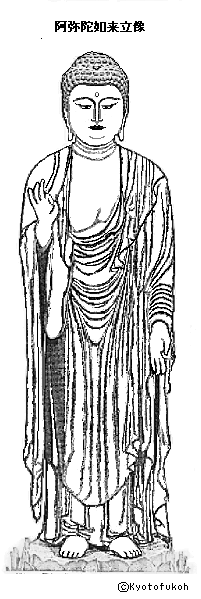 仁和寺街道沿いに報土寺(ほうど-じ)はある。山号は八幡山(はちまん-さん)という。 白壁の高い築地塀に囲われ、薬医門を堅く閉じている。界隈の西陣の四番町、隣接する五番町は、かつて遊郭として栄えた。引き取り手のない遊女遺骸を弔っていたことから「投げ込み寺」と呼ばれていた。 浄土宗知恩院派。本尊は阿弥陀如来像。 洛陽四十八願所地蔵めぐり(京都四十八願寺)の札所、札所本尊は腹帯地蔵。 ◆歴史年表 創建の詳細、変遷は不明。 平安時代、859年/貞観年間(859-877)、行教(ぎょうきょう)が真言宗の寺として創建したという。 室町時代、応仁・文明の乱(1467-1477)により荒廃する。 1559年、選誉照阿(せんよ-しょうあ)により、浄土宗の寺院として再興された。相国寺惣門の東南(上京区)に移る。以後、浄土宗の念仏道場として栄えた。 江戸時代初期、黒田官兵衛(孝高、如水)の妻・光姫(てるひめ、戒名・照福院殿念誉浩永大禅定尼)が、当寺の塔頭・照福院(しょうふくいん)を建立した。寺域に茶室「松陽亭」が建てられ、夫、豊臣秀吉、石田三成も当寺を訪れたという。(過去帳)。 1627年、光姫の没後、塔頭・照福院に墓が立てられる。 1663年頃、現在地(上京区)に移転する。塔頭・照福院は本寺に統合された。 寛文年間(1661-1673)、腹帯地蔵は第112代・霊元天皇の命により、僧・宝山が洛外・六地蔵以外の48か寺の地蔵尊を選んだ洛陽四十八願所の霊場の一つになる。 近代、1868年、神仏分離令後の廃仏毀釈以後、塔頭2院が廃された。境内も狭められる。境内には一時、仁和小学校が置かれたという。 ◆行教 平安時代前期の僧・行教(ぎょうきょう、?-?)。男性。父・山城守・紀魚弼。行表、真言宗の宗叡に師事する。858年、真雅の推挙により、藤原良房の外孫・惟仁親王(第56代・清和天皇)の即位祈祷のため、859年、藤原良房の命により、宇佐八幡宮(宇佐神宮)で天皇護持の90日間参籠をした。平安京の近くに遷座せよとの託宣により、860年、宇佐神宮から男山・護国寺に八幡大菩薩を勧請し、石清水八幡宮を創建した。863年、伝灯大法師位に任じられた。 ◆選誉 照阿 室町時代の浄土宗の僧・選誉 照阿(せんよ-しょうあ、?-?)。詳細不明。1559年、報土寺を再興した。 ◆櫛橋 光 室町時代後期-江戸時代前期の櫛橋 光(くしはし-てる/みつ、1553-1627)。女性。櫛橋照。父・播磨国加古川の志方城主・櫛橋伊定(これさだ)の次女。1567年、小寺政職の養女になる。15歳で、小寺家家老・黒田孝高(官兵衛)の正妻として嫁ぎ、姫路城に入る。才徳兼備であり、当時としては珍しい一夫一妻の夫婦になる。1568年、松寿丸(後の福岡藩主・長政)、1582年、熊之助を産む。当初、夫・孝高は、織田信長を高く評価し、主君・小寺政職に臣従を進言する。1578年、播磨国・別所長治が信長に叛き、志方城の兄・櫛橋政伊も呼応した。志方城は織田信雄方に包囲され降伏した。孝高は有岡城に幽閉され、信長は人質の松寿丸の殺害を秀吉に命じた。孝高の盟友・竹中半兵衛により松寿丸は匿われ助かる。後、孝高は豊臣秀吉の腹心になり、豊前国中津の大名になる。光は大坂に質として置かれた。1597年、熊之助は、父・兄を追い朝鮮に渡る途中、玄界灘で暴風雨に遭い亡くなる。1600年、関ヶ原の戦いの直前、石田三成は大坂の大名妻子を人質として大坂城に移そうとした。細川忠興の妻・細川ガラシャは抗して自害した。その隙に孝高の家臣は、長政正室・栄姫、光らを長柄の屋敷より救う。菰に包まれ米俵に似せて担ぎ出され、中津城へ船で脱出させた。1604年、夫没後に出家、菩提のために圓應寺(福岡)を建立した。京都に報土寺の塔頭・照福院を建立する。熱心な浄土宗の信徒だった。75歳。 墓は、報土寺、崇福寺(福岡)、圓應寺(福岡)にある。肖像も伝わる。 ◆仏像 ◈美仏の「阿弥陀如来立像」(79.2/80.3㎝)(重文)は、鎌倉時代中期、「正嘉二年(1258年)七月十二日」の銘が左足臍(ほぞ)にある。かつて、近江の八幡宮に安置されていたという。近代、1942年に、旧国宝に指定された、当時の恩賜京都博物館に寄託された。上品下生印を結ぶ。鎌倉時代の快慶(?-?)が創出した安阿弥様(あんなみょう)と呼ばれる三尺阿弥陀如来の基準作とされた。木造、漆箔、玉眼。現在は、京都国立博物館寄託。 ◈本堂に「地蔵菩薩」が安置されている。鎌倉時代作になる。 ◈ほかにも諸仏があり、廃寺になった旧塔頭の遺仏という。 ◆阿弥陀如来立像 本尊の阿弥陀如来立像には伝承が残る。かつて、近江の八幡宮に安置されていたという。 ある時、住職の夢に阿弥陀如来が現れ、東より手招きした。住職がその方に進むと、近江八幡に行き着く。土中が光り輝き、阿弥陀如来が出現した。阿弥陀如来は報土寺に遷ることを望み、当寺に遷されたという。(縁起絵巻) ◆腹帯地蔵 地蔵堂に、「腹帯地蔵」(2m)が安置されている。妓楼「生駒楼」の寄進による。江戸時代前期、洛陽四十八願地蔵の一つに数えられた。かつては、腹帯を授与していた。彩色。 扁額には「腹帯地蔵」、「生