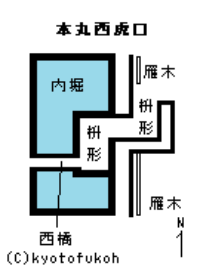 ![]() 東橋、本丸櫓門 ![]() 内堀と本丸櫓門 (重文)、東橋 ![]() ![]() 石垣、袖堀、奥は東虎口 ![]() 石垣に残る寄進した大名の刻印 ![]() 東虎口 ![]() ![]() 本丸御殿(重文)(非公開) ![]() 本丸御殿の御常(おつね)御殿、起り屋根 ![]() 御常御殿 ![]() 玄関車寄 ![]() 天守跡からの眺望、御常御殿(右端)、御書院(中央)、台所、御殿庭園、奥の山は比叡山。 ![]() ![]() 行幸御殿跡 ![]() 本丸御殿 ![]() 天守台、岩岐(がんき) ![]() 天守台からの南東方向の眺望 ![]() 天守台の石垣部分 ![]() 【参照】天守閣が描かれている。「二条城と所司代屋敷」(「洛中洛外図屏風」、1615年-1617年、京都大学総合博物館の説明板より) ![]() 【参照】築城当初の天守、場所は現在の清流園付近(「洛中洛外図六曲屏風一双」)、京都市の案内板より ![]() 西虎口 ![]() 本丸西外桝虎口、西橋 ![]() 本丸、西虎口、唯一の出桝形空間。 ![]() 天守跡(左奥)、西虎口、内堀 ![]()