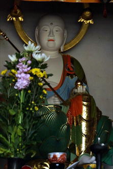 ◆妻娶地蔵 地蔵堂安置の延命地蔵尊は、妻娶地蔵(つまとりじぞう、妻娶結地蔵、妻取地蔵)と呼ばれている。彩色され蓮華座に坐り、左足を下げた半跏像、右手斜めに錫杖、左手に宝珠を載せる。像高1m。