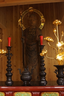 ◆地蔵菩薩立像 観音像はかつて近江・堅田の別院に安置されていた。安土・桃山時代、1571年、織田信長の比叡山焼き討ちに際し、その兵火を避けて、蓮阿弥という僧兵の笈に背負われ当寺に遷された。同座していた地蔵菩薩像はその地に残される。後に、地蔵菩薩は近くの百姓・新左衛門に夢告し、観音像の元に遷り衆生済度を望んだ。そのため笈に入れられ当寺に遷されたという。以後、後追地蔵と呼ばれた。