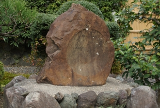俊恵の歌碑、詞書「故郷の月をよめる」「ふる里の板井の清水み草いて月さへすまず成にけるかな」(『千載集』「雑上」巻16)、俊恵が長旅から帰郷すると寺が荒廃し、それを嘆いて詠んだという。