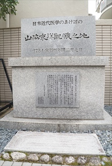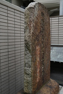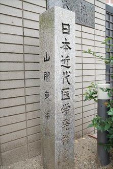 住宅街のあるマンション入口に「日本近代医学発祥之地(にほん-きんだい-いがく-はっしょう-の-ち) 山脇東洋顕彰(やまわき-とうよう-けんしょう)」「勤王志士(きんのう-しし)