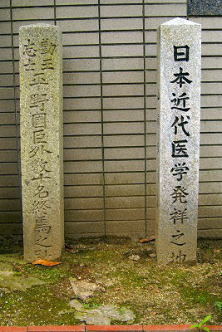 ![]() 「日本近代医学発祥之地」、「勤王志士平野國臣外十数名終焉之地」の石標 ![]() ![]() ![]() 「平野国臣他勤王志士終焉の跡」の石碑 ![]() 「平野国臣他勤王志士終焉の跡」の石碑、碑は解剖に使われていた「手術台」ともいう。 ![]() 「日本近代医学のあけぼの 山脇東洋観臓之地」の石碑、「山脇東洋観臓之地」の文字は、東洋の『臓志』の自筆の文字を組み合わせている。花崗岩製。 ![]() 延命地蔵尊、志士を祀る。 |