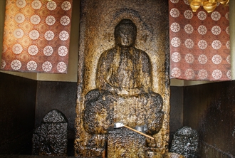 油掛町の新丸太町通の南、有栖川沿いの四辻の交差する地点に地蔵堂が建つ。堂内に、油掛地蔵(あぶらかけ-じぞう)が安置されている。道は北へ向かうと大覚寺へ、西へ向かうと天龍寺、嵐山へ通じている。堂には、「大覚寺油掛地蔵尊」の看板が掲げられている。 地蔵尊に油を掛けると所願成就するといわれている。地蔵尊は長年にわたり油を掛けられ、油の匂いが立ち、油は層を成し黒変している。 ◆歴史年表 創建の詳細、変遷は不明。 鎌倉時代、1310年、願主・平重行により、阿弥陀三尊として安置されたという。 江戸時代、1680年、黒川道祐の「嵯峨行程」に記述があり、地蔵尊には油商人が必ず油を掛けて通っていたという。(『東北歴覧記』) ◆地蔵尊 油掛地蔵と呼ばれている。実際には、蓮華座の上に、定印を結び結跏趺坐した阿弥陀如来坐像になる。本来は阿弥陀三尊であり、阿弥陀仏の頭部の左右にそれぞれ小さく観音菩薩、勢至菩薩の種字(しゅし、梵字)が刻まれた三尊形式になっている。また現在は、阿弥陀仏の左右に2つの石仏が置かれている。 光背の外、左には小さく「願主 平重行」、右に鎌倉時代「延慶三庚戌(1310年)十二月八日」の銘が刻まれている。鎌倉時代作在銘の石仏は、京都に2体しか現存していないという。 地蔵尊の信仰の起源について、古代(奈良時代-平安時代)、この付近に勢力を有していた阿刀(あと)氏が禊祓(みそぎはらえ)の職掌にあり、禊行為の一種ともいう。少なくとも江戸時代には油を商う者は、辻堂を通り過ぎる際には、必ず像に注いで通り過ぎていたという。その理由は不明としている。(黒川道祐『東北歴覧記』の「嵯峨行程」、江戸時代前期、1680年) 像は厚肉彫りで光背の縁を残し、地部分も内側に彫り込んでいる。像高113cm、頭部27cm、蓮華座の高さ20cm、その下の台座部(反花)11cm。光背上部の両肩を斜めに大きく切り落としている。光背の高さ170cm、幅84cm、厚さ40cm。上部両角を落とした最上部の幅50cm、下の縁の厚さ16cm、花崗岩製。 ◆洗脚石 妙心寺塔頭・大龍院(右京区)に、「関山国師洗脚石(せんきゃくいし、洗脚関山石)」と呼ばれる石がある。伝承がある。 鎌倉時代の妙心寺開山・関山慧玄(1277-1361、無相大師)は、天龍寺の夢窓疎石(1275-1351)を訪問した。その際に、必ず油掛地蔵尊の処で、前に流れる川で足を洗い身を清めていたという。後に、天龍寺の僧侶がこの事に気づき、洗いやすいようにと、川の畔に石を移して置いた。その後、天龍寺塔頭・南芳院に移され保存された。(『正法山誌』)。 近代、今川貞山(1826-1905)により天龍寺より妙心寺塔頭・大龍院に移された。石は、今も庭園高台に残されている。貞山は、妙心寺派管長を務め、妙心寺に大龍院を再興している。 *年号は原則として西暦を、近代以前の月日は旧暦を使用しています。 *参考文献・資料 「油掛地蔵尊奉賛会」の案内板、『新版 京のお地蔵さん』、『京都市の地名』、『昭和京都名所図会 4 洛西』、『京都大事典』 ![]() ![]() ![]() ![]() ![]() ![]() |