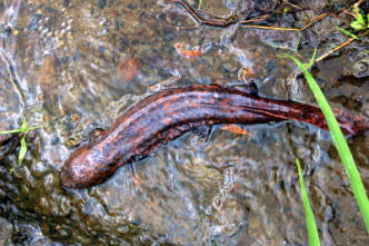 ![]() 鴨川源流、オオサンショウウオ(体長70cmほど)、傷を負って死んでいた。(2007年) ![]() 鴨川中流域でのオオサンショウウオ(体長60㎝ほど)(2010年8月) |
