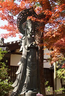 妙心寺の塔頭・霊雲院(れいうん-いん)は、狩野元信の障壁画があり「狩野元信寺(元信寺)」とも呼ばれている。 臨済宗妙心寺派。妙心寺四派本庵の一つ。 ◆歴史年表 室町時代、1526年、妙心寺25世・大休宗休(だいきゅう-そうきゅう)は、特芳禅傑(どくほう-ぜんけつ)を勧請開祖として創建した。模堂清範尼の帰依を受け、その寄進により一院を創建した。 1543年、栂尾・閼伽井房(十無尽院)を移して方丈にする。隣接して書院を建てる。以後、第105代・後奈良天皇(1497-1557)の臨幸が相次ぐ。 江戸時代、1693年、大休150年遠忌に際して、現在の方丈が造替になる。 ◆特芳 禅傑 室町時代前期-後期の臨済宗の僧・特芳 禅傑(どくほう-ぜんけつ、1419-1506)。男性。諡号は大寂常照禅師。尾張(愛知県)の生まれ。幼少で出家、東福寺、龍安寺の義天玄詔(ぎてん-げんしょう)、美濃・汾陽寺(ふんようじ)の雲谷玄祥(うんこく -げんしょう)、伊勢・大樹寺の桃隠に師事、1473年、妙心寺・雪江宗深(せっこう-そうしん)の法を嗣ぐ。龍安寺、丹波・竜興寺、摂津・海晴寺、妙心寺開堂、1478年、大徳寺住持になる。瑞泉寺、1488年、再興された龍安寺に帰り中興開山になる。1492年、丹波・竜潭寺(旧大梅寺)の開山。1504年、龍安寺・西源寺で隠退する。西源寺より出された語録に「西源特芳和尚語録」がある。88歳。 詩文に秀でた。弟子に大休などがある。 ◆大休 宗休 室町時代後期の臨済宗の僧・大休 宗休(だいきゅう-そうきゅう、1468-1549)。男性。諡号は円満本光国師。幼くして東福寺・永明庵で出家、龍安寺・特芳禅傑(とくほう-ぜんけつ)に師事、印可を受けた。その没後、西源院、龍安寺、妙心寺の住持。晩年は霊雲院を開創し住した。今川義元の招きにより、駿河国・臨済寺を開山、妙心寺・尾張国瑞泉寺などを歴住した。1542年、第105代・後奈良天皇は大休に印記を受ける。天皇より諡号を賜った。著『見桃録』。82歳。 特芳禅傑の三哲の一人。 ◆模堂 清範尼 室町時代の尼僧・模堂 清範尼(もどう-せいはんに、?-1534)。詳細不明。女性。赤松氏女、薬師寺備後守国長の母。 ◆子建 西堂 室町時代後期-安土・桃山時代の臨済宗の僧・子建 西堂(しけん-せいどう、1486-1581)。詳細不明。男性。寿寅、是庵。慈雲庵・黙堂の法嗣。相国寺・慈雲庵、西芳寺の住職になる。竜安寺石庭を作庭したともいう。師に倣い、声明をよくした。95歳。 ◆狩野 元信 室町時代後期の画家・狩野 元信(かのう -もとのぶ、1476?-1559)。男性。山城国の生まれ。父・狩野派始祖・正信。大炊助、越前守、法眼に叙せられる。作品に「鞍馬寺縁起」(1513)、同年頃、大徳寺大仙院客殿障壁画を一門、相阿弥とともに制作した。石山本願寺(大坂本願寺)障壁画(1539-1553)、妙心寺霊雲院旧方丈障壁画(1543)がある。83歳。 分業による制作を確立し、中国絵画、室町水墨画、やまと絵の技法も取り入れ、狩野派の基礎を築いた。 ◆西田 幾多郎 近代の哲学者・西田 幾多郎(にしだ-きたろう、1870-1945)。男性。石川県の生まれ。金沢・高等中学(後の第四高等学校)で同級に鈴木大拙がいた。同校中退。1894年、東京大学哲学科選科卒業。1896年、金沢・第四高等学校講師、後に教授。1909年、学習院教授。近衛文麿らが影響を受けた。幾多郎は、参禅し、T.H.グリーン、W.ジェームズの哲学に学ぶ。1910年以後、京都帝国大学で倫理学、宗教学、1914年、哲学科教授になる。1911年、『善の研究」を刊行し主意主義に立つ。1928年、退官後、「場所的論理と宗教的世界観」を完成させた。1940年、文化勲章受賞。 若い頃より禅に関心を寄せ、禅師を訪ね、妙心寺で参禅、金沢・臥龍山雲門老師にも参じ続けた。1927年の『働くものから見るもの』で、西洋哲学の「場」と、仏教(禅)、儒教などの東洋思想の「無」とを統合した。「場所」「絶対無」「絶対矛盾的自己同一」など、「西田哲学」体系を構築し、田辺元とともに京都学派をなした。 墓は妙心寺・霊雲院にある。 ◆木像 本堂に「円満本光国師(大休宗休)木像」、「特芳禅傑禅師木像」を安置している。 ◆四派四本庵 室町時代、塔頭の龍泉庵(1481)、東海庵(1484)に加え、聖澤院(1523)、霊雲院(1526)が創建された。 雪江宗深(せっこう-そうしん)の法嗣から四派の、景川宗隆(けいせん-そうりゅう、龍泉派)、悟渓宗頓(ごけい-そうとん、東海派)、特芳禅傑(とくほう-ぜんけつ、霊雲派)、東陽英朝(とうよう-えいちょう、聖澤派)が出る。 四本庵はそれぞれ、龍泉庵、東海庵、霊雲院、聖澤院を拠点にした。これにより、「四派四本庵(しはしほんあん)」による運営体制が確立した。この四派により、一山の全権が掌握され、住持も決定された。 師・雪江は4人を評し、「禅は景川、徳(福)は悟渓、寿(頌)は特芳、才は東陽」としている。 ◆建築 ◈「方丈」は、江戸時代前期、1693年に再建されている。 それ以前に、室町時代後期、1543年、大休は、栂尾・閼伽井房(十無尽院)を買い取り移築している。 ◈「書院(御幸の間)」(重文)は、室町時代後期、1532年頃の建立ともいう。第105