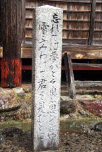 ![]() ![]() ![]() 「文徳天皇第一皇子 惟喬親王遺跡」の石標 ![]() 「忘れては夢かとそ思ふ思ひきや雪ふみわけて君を見むとは」の石標、在原業平、「古今集」巻18、雑歌下・970。『伊勢物語」第83段「小野の雪」 ![]() 境内よりの遠景 |