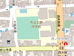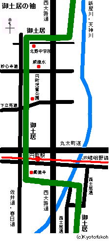 円町付近には、豊臣秀吉が築造した御土居が、西側に凸状に張り出している部分がある。「御土居の袖(おどい-の-そで)」といわれている。 ◆歴史年表 安土・桃山時代、1592年、豊臣秀吉は、京都の町を取り囲む土塁「御土居(おどい)」を、わすが数カ月の短期間で築造した。総延長は22.5kmになる。 ◆豊臣 秀吉 室町時代後期-安土・桃山時代の武将・豊臣 秀吉(とよとみ-ひでよし、1537-1598)。男性。幼名は日吉丸、初名は木下藤吉郎。小猿と呼ばれた。父・尾張国(愛知県)の百姓、織田信秀の足軽・木下弥右衛門、母・百姓の娘・なか(天瑞院)。1551年、家出し、後に今川氏の家臣・松下之綱、1554年、織田信長に仕える。1561年、浅野長勝の養女・ねねと結婚し、木下藤吉郎秀吉と名乗った。戦功を重ね、1573年、小谷城主、羽柴姓と筑前守、信長の天下統一にともない西国転戦した。1582年、備中高松城の毛利軍と戦いの最中に本能寺の変が起こり和睦した。軍を返し山崎で明智光秀を討つ。1584年、小牧・長久手で織田信雄、徳川家康の連合軍に敗れる。1585年、紀州根来と雑賀、四国・長宗我部元親を服した。関白に進む。1586年、聚楽第、広寺大仏造営に着手し、太政大臣に昇り豊臣の姓を賜わる。1587年、九州征討、聚楽第が完成する。旧10月、北野天満宮で北野大茶湯を催した。1588年、第107代・後陽成天皇が聚楽第を行幸する。検地、刀狩を行う。1590年、小田原の北条氏直らの征討、朝鮮使を聚楽第に引見した。1591年、利休を自刃させる。1592年、文禄の役を始めた。甥の養子・秀次に関白職を譲り、太閤と称した。1593年、側室淀殿に秀頼が生まれると、1595年、秀次を謀反人として切腹させ、妻妾子女らも処刑した。1597年-1598年、朝鮮を攻めた慶長の役に敗れた。1598年、旧3月、醍醐寺で「醍醐の花見」を行う。旧8月、伏見城で没した。62歳。 「普請狂」と称された。京都で「都市改造」を行う。1585年-1591年、洛中検地・洛中地子免除(1591)、1586年よりの方広寺大仏建設、1586年-1587年、聚楽第・周辺の武家邸宅街建設、1589年、禁裏・公家町の修造整備、1590年、新町割建設(短冊形町割)、1590年、三条大橋などの橋梁・道路建設、1591年、御土居築造、寺院街(寺町・寺之内)建設、1595年、方広寺大仏、1597年、伏見城を建てた。ほか、関所廃止、楽市・楽座制、重要都市・鉱山直轄、貨幣鋳造、太閤検地・刀狩、伏見の城下町化、宇治川の整備、倭寇取締、朱印貿易などを進めた。没後、豊国廟に豊国大明神として祀られた。 ◆御土居の袖 御土居の西側、中央付近、現在の丸太通を挟む南北の土塁の一部は、西側に張り出す形になっていた。この部分は、聚楽第の西に位置しており、「御土居の袖(そで)」といわれた。 紙屋川の西に沿い、南下してきた御土居は、やがて川より離れる。現在の北野中学校の北側の延長線上より西進し、西に大きく張り出していた。南北の佐井通(春日通)に当り、通りに沿う形で再び南下し、丸太町通を越えた。さらに南の眞徳寺を経て、朱八会館付近より向きを変え東進した。西大路通を越え、西土居通に戻り南下していた。 袖の張り出した理由については諸説ある。 1.虎口(こぐち、城郭などの最も要所にある出入り口)として、敵の侵入に対し、鉄砲、槍での防御を可能にするため設けられた。 2.名水「威徳水(いとくすい)」「堀の水」などの、良質で豊富な地下水脈を御土居内に取り込むために行われた。(今井松太郎、1965年) 3.紙屋川の治水・開発に伴うものともいう。 4.付近の街道筋の町並・寺などを取り込むためのものともいう。(大塚隆、1979年) 5.西大路通の東にある西之京の弘誓寺(ぐぜい-じ)(西弘誓寺、中京区西ノ京中保町1)を御土居内に取り込むために設けられたともいう。(森谷尅久・横井清、1967年) 浄土宗の西弘誓寺は、安土・桃山時代、1586年に秀吉により建材を寄進されたという。また、東弘誓寺(上京区長門町419-2)の開祖・潤屋玄富(?-1632?)は、秀吉の信を得ていた。玄富は、五百羅漢の安置場所を秀吉に請い、秀吉は京都所司代・前田玄以に命じ土地を贈り、後に西弘誓寺(開祖・玄富/郷貫?)を創建したともいう。 6.袖の南半分、円町付近(左京一条二坊十四町、西ノ京北円町付近)にかつて西獄(右獄)があり、その敷地を回避したためともいう。 7.江戸時代に御土居堀の付け替えが行われたともいう。(石田孝喜、1978年・1990年)。袖も、江戸時代に新たに付け替えられた可能性があるともいう。(中村武生) ◆北野中学校の御土居 「御土居の袖」の北西角、北野中学校(中京区西ノ京中保町1-4)内に御土居の一部が残されている。グラウンドの北側、東西方向にある。国史跡以外で、土塁遺構が良好な状態で残されているのは、北野中学校内と大宮交通公園(北区紫竹北栗栖町3)内の2カ所しかない。 以前には、京都第二商業学校があった。当時は、敷地の北側と西側に屈曲した連続する土塁が残されていた。移転時に西側の南北方向の土塁は、整地のために消滅した。土塁の北側(外側、現・プールの地点)には