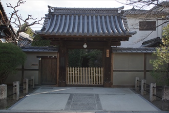 建仁寺境内の北西に境外塔頭・大中院(だいちゅういん)がある。門前には花見小路が通じ、山門は西面している。 臨済宗建仁寺派。本尊は観音菩薩。 ◆歴史年表 南北朝時代、1342年/康永年間(1342-1344)、建仁寺27世・東海竺源(とうかい-じくげん)が創建した。その塔所になる。(『坊目誌』) 室町時代、応仁・文明の乱(1467-1477)により荒廃した。 1552年、焼失した。 江戸時代、1655年/承応年間(1652-1655)、雪窓霊玉(せっそう-れいぎょく)が中興した。現在の本堂、庫裏などが建てられた。 文化年間(1804-1818)、景和竺応、全室慈保(ぜんしつ-じほ)らが堂宇を再建する。霊洞院より移築する。 ◆東海竺源 鎌倉時代中期-南北朝時代の臨済宗の僧・東海竺源(とうかい-じくげん、1270-1344)。詳細不明。諡号は法光安戚禅師。東福寺の無関普門らに学ぶ。紀伊・西方寺(興国寺)の無本覚心の法嗣になる。筑前・聖福寺、万寿寺、建仁寺27世住持を歴任した。 法灯派。 ◆雪窓霊玉 江戸時代前期の臨済宗の僧・雪窓霊玉(せっそう-れいぎょく、?-1669)。詳細不明。1655年、建仁寺・大中院を中興した。 ◆景和竺応 江戸時代後期の臨済宗の僧・景和竺応(けいわ-、?-?)。詳細不明。文化年間(1804-1818)、建仁寺・大中院の堂宇を再建した。 ◆全室慈保 江戸時代後期の臨済宗の僧・全室慈保(ぜんしつ-じほ、?-?)。詳細不明。妙光寺63世、建仁寺348世になる。文化年間(1804-1818)、建仁寺・大中院の堂宇を再建する。 ◆建築 現在の本堂、庫裏は承応年間(1652-1655)に再建された。 書院の8畳2室は、慶長年間(1596-1614)に建てられている。その後、文化年間(1804-1817)に霊洞院より移築された。 ◆茶室 書院の西にある茶室「燕舞軒(えんぶけん)」は、江戸時代、宝暦年間(1751-1763)、白堂笠津の時に建てられたとみられている。三畳中板台目幅洞床。庵号は陶淵明(365-427)の詩句「燕舞春日長」より採られた。北の庭より縁を経て貴人口より入る。床の間前に地板があり、雁木形に中板が置かれ、間に炉が切られている。地板の右に丸窓、引違の貴人口がある。床の間左に火灯口がある。草書の扁額は黄檗宗・無染丹崖(みぜん たんがい、?-1764)の筆による。 席の南の七畳に遠州流の茶室がある。近代以降に加えられ、炉が切られている。その西の六畳に住職の居室があり、北の物入前地板にも丸炉がある。 ◆文化財 鎌倉時代、14世紀の絹本淡彩「闡堤正具像 自賛」1幅(重文)、京都国立博物館寄託。 室町時代、15世紀の松屋宏蔭筆、絹本淡彩「大黒天像 原古志稽 賛」。 清時代、1718年の玉けん筆、紙本墨画淡彩「法李唐山水図」。 江戸時代、17世紀の狩野安信(1614-1685)筆の絹本墨画「山水図」。 鎌倉時代、13-14世紀の紙本木版「無門関」。 江戸時代、1607年の「七条袈裟 三江紹益所用」。 江戸時代、18-19世紀の奥田頴川(1753-1811)作の「赤絵十二支四神鏡文皿」「呉州赤絵麒麟花鳥文火入」など。 江戸時代、19世紀の仁阿弥道八(にんあみ どうはち、1783-1855)作「色絵竹隠和尚坐像」など。 ◆障壁画 書院に安土・桃山時代(17世紀)、海北友松(1533-1615)筆、紙本墨画「山水図襖(彩山水画)」、水墨「鷺図」など8面がある。 *年号は原則として西暦を、近代以前の月日は旧暦を使用しています。 *参考文献・資料 『建仁寺』、『京都の禅寺散歩』、『建仁寺 建仁寺と栄西禅師』、『京都・山城寺院神社大事典』、『旧版 古寺巡礼京都 6 建仁寺』、『京の茶室 東山編』、『昭和京都名所図会 2 洛東 下』 、ウェブサイト「コトバンク」 ![]() ![]() ![]() ![]() |