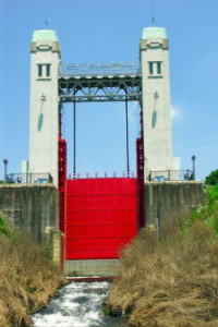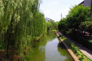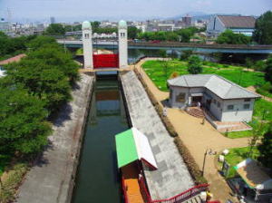 ![]() 出合橋、濠川と派流の分岐点、一帯の川岸には散策道が付けられている。十石舟は月桂冠大蔵記念館裏-伏見港公園間を往復している。 ![]() 濠川の終点にある伏見港公園、閘門で仕切られた部分内を「閘室」と呼ぶ。ここに、運航している十石舟の船着場がある。右の建物は三栖閘門資料館(旧・三栖閘門操作室)。遠景は伏見の市街地。 ![]() 伏見港公園にある三栖閘門、閘門上は展望台であり宇治川、向島などが見渡せる。 ![]() 宇治川派流には三栖洗堰もあり、宇治川に合流している。 ![]() 濠川の西を流れている新高瀬川(東高瀬川の下流域)、宇治川に合流している。 |