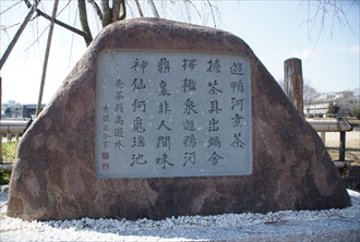 鴨川にかかる北大路橋の東詰北に、「売茶翁没後二百五十年記念碑」が立てられている。江戸時代の伝説的な僧・売茶翁(ばいさおう/まいさおう)は、煎茶の茶神といわれた。 ◆歴史年表 現代、2013年、売茶翁没後二百五十年を記念し、「売茶翁没後二百五十年記念碑」が立てられた。 ◆売茶翁 江戸時代前期-中期の黄檗宗(おうばく)の僧・売茶翁(ばいさおう/まいさおう、1675-1763)。俗名は柴山元昭、僧号は月海、還俗し高遊外(こうゆうがい)。肥前(佐賀県)蓮池(はすのいけ)の生まれ。鍋島家殿医の子。11歳で出家し、黄檗山萬福寺末の肥前・龍津(りゅうしん)寺の化霖道竜(けりん-どうりゅう)に師事した。13歳で師とともに宇治・萬福寺の独湛性瑩(どくたん-しょうけい)に師事し、偈を与えられる。22歳で病になり、諸国歴遊後、陸奥仙台・万寿寺で月耕道稔に参じ、臨済宗、曹洞宗の僧にも参禅する。その後、肥前の師のもとに戻り14年間仕えた。師没後、1732年、上洛する。宇治田原の茶業家・永谷宗円(ながたに-そうえん)と会い、永谷が考案した青製煎茶を売る生活に入る。腐敗した禅僧社会への警句とした。還俗後は高遊外に改めた。61歳で東山に煎茶の喫茶店「通仙亭(つうせんてい)」を開く。1755年、売茶業を廃業し揮毫を行う。蓮華王院の南、幻々庵で亡くなる。著『梅山種茶譜略』、詩『売茶翁偈語』。88歳。 「売茶翁」と称された。「煎茶の中興の祖」、「本朝煎茶の茶神」と呼ばれる。伊藤若冲、池大雅、与謝蕪村、小野蘭山、大典顕常、木村蒹葭堂らと親交あり、彼らは売茶翁を描いている。萬福寺に木彫の座像がある。相国寺の大典顯常と知りあい、大典は伝記『売茶翁伝』を記している。 ◆碑 2013年、売茶翁没後二百五十年を記念し、煎茶道関係者「売茶翁没後二五〇年記念事業実行委員会」により「売茶翁没後二百五十年記念碑」が建立された。 碑文には「遊鴨河煮茶/担茶具出蝸舎/択檻泉遊鴨河/鼎裏非人間味/ 神仙何覓瑶池 売茶翁高遊外 黄檗亘令書 印で黄檗山主 亘令」とある。 「鴨河に遊び 茶を煮る/茶具を担い蝸舎(かしゃ)を出(い)で/檻泉(かんせん)を択(えら)んで 鴨河に遊ぶ/鼎裏(ていり)人間(じんかん)の味に非ず/神仙何(なん)ぞ瑶池(ようち)を覓(もと)めん/売茶翁高遊外(ばいさおうこうゆうがい)」。 副碑文には「売茶翁高遊外(一六七五∼ 一七六三) 名は高遊外、人は売茶翁と呼んだ。江戸時代、佐賀県蓮池に生まれ、十一歳で出家、黄檗宗僧侶から五十七歳で還俗、京に上る。鴨川畔など風光明媚なところで往来に茶を振舞う。翁を慕い池大雅や伊藤若冲などの文人が集い文化サロンを形成。お茶を急須で淹れる方式が評判となり、その後煎茶が全国に普及した。その精神世界は後に煎茶道の世界に受け継がれている。」とある。 *原則として年号は西暦を、近代以前の月日は旧暦を使用しています。 *参考文献・資料 説明板、『若冲の花』 、ウェブサイト「コトバンク」 ![]() ![]() ![]() ![]() ![]() |