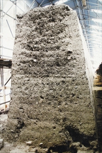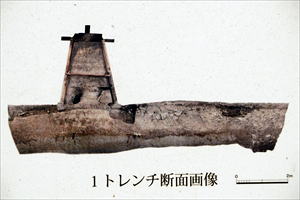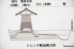![]() 蓮 ![]() ![]() 境内にはクスノキなどの巨木が植えられている。 ![]() 小野道風ゆかりの柳 櫛笥小路![]() 東築地塀 ![]() 東築地塀、5本の筋塀、定規筋 東塀跡の断面写真、説明板より![]() 東塀跡の断面図、説明板より ![]() 【参照】「東門前町」の地名