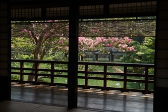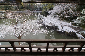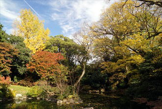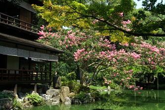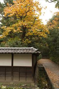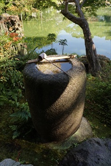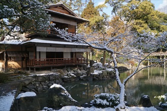 京都御苑内に九条(九條)家の遺構「拾翠亭(しゅうすい-てい)」が建てられている。かつてこの地には、五摂家の一つ、九条家の屋敷があり、別荘として使用されていた。 現在は、拾翠亭と池だけが残されている。九条家の現存唯一、また、現存する貴族の茶室として数少ない遺構とされている。 アメリカ合衆国の日本庭園専門誌"Sukiya Living Magazine, The Journal of Japanese Gardening"の「しおさいプロジェクト」「日本庭園ランキング(数寄屋生活空間)」に、2007年に第23位に選ばれている。 ◆歴史年表 江戸時代、1778年頃、庭園が作庭されたという。 寛政年間(1789-1801)、建物が造立された。 幕末、米総領事・ハリスの通商条約締結要請に対し、開国派の関白・九条尚忠は、その向かい東隣の屋敷にあった攘夷論の太政大臣・鷹司政通と対立した。幕府と朝廷の交渉は尚忠邸で行われた。 1864年、禁門の変では焼失しなかった。 近代、1869年、第122代・明治天皇、最後の藤原氏長者・左大臣・九条道孝は東京に移った。 1878年、勾玉池(九条池)に仮橋が架けられる。 1882年、池に現在の高倉橋が架かる。 ◆九条 兼実 平安時代後期-鎌倉時代前期の政治家・九条 兼実(くじょう-よしみち、1149-1207)。男性。父・摂関家・藤原忠通、母・女房加賀(藤原仲光の娘)。1166年、右大臣になる。1156年、異母姉の皇嘉門院の猶子、1158年、兄・基実の猶子として元服、左近衛権中将、権中納言、左近衛権中将、権大納言・右近衛大将、内大臣を経て、1166年、右大臣に進み、1174年従一位に昇る。1179年、平清盛の権力奪取後、1185年、頼朝内覧の宣旨により、1186年、摂政・藤原氏長者になる。1187年、記録所を設ける。1189年、太政大臣、1190年、娘・任子を入内させ、第82代・後鳥羽天皇中宮になる。1192年、後白河法皇(第77代)没後、頼朝に征夷大将軍を宣下する。だが、1196年、政変により失脚した。弟の天台座主・慈円の後見になり仏教界に影響を及ぼす。息子、妻を亡くし法然へ帰依した。1202年、出家、円証と号した。後法性寺殿、月輪殿と称された。59歳。 和歌に親しみ、藤原俊成・定家らの庇護者になる。40年間の日記『玉葉(ぎょくよう)』がある。 九条家を興した兼実は法性寺に葬られ、墓は東福寺(東山区)内にある。 ◆九条 尚忠 江戸時代後期-近代の公家・九条 尚忠(くじょう-ひさただ、1795-1871)。男性。父・二条治孝、母・信子。九条輔嗣の嗣子。1858年、日米修好通商条約の締結により、1856年、関白として幕府との協調路線をとる。将軍継嗣問題では徳川慶福(家茂)擁立を図る南紀派につく。第121代・孝明天皇、廷臣の不信により、内覧を辞職しのち復職した。1862年、実現した和宮降嫁を進め公武合体に尽力した。攘夷派の糾弾により、1862年、関白・内覧を辞し、岩倉具視らと落飾・重慎に処せられ九条村に閉居した。1867年、免除され還俗を許される。74歳。 ◆九条家 九条家(くじょうけ)は、藤原氏北家の嫡流、五摂家の一つになる。家号は始祖・九条兼実(1149-1207)の九条殿に因む。兼実は関白・藤原忠通(1097-1164)の3男になる。九条の坊名に因み陶化(とうか)ともいう。これは、京都の南東部の九条陶化坊に領地を有していたことによる。 平安時代後期、摂政・関白・氏長者の地位は、藤原道長の子孫・御堂流の嫡流だった。鎌倉幕府を開いた源頼朝(1147-1199)は、兼実を摂政・氏長者に推挙した。以後、九条家は兄・基実(1143-1166)の近衛家と対立し、摂関家は二分される。孫・道家の子・良実(1216-1270)、実経(1223-1284)が、それぞれ五摂家の二条家、一条家を立てた。 安土・桃山時代、豊臣秀吉は、御所南に九条家の領地を移させた。九条家は最盛期に敷地は1万7000坪、建物も3800坪を有したという。 幕末、関白・尚忠(1798-1871)は佐幕派、道孝(1839-1906)は、官軍奥州鎮撫総督に任じられた。近代以降、九条家は公爵になった。道孝四女は、第123代・大正天皇の貞明皇后(九条節子、1884-1951)になっている。 ◆拾翠 「拾翠亭」の「拾翠(しゅうすい)」とは、「緑の草花を拾い集める」の意味があるという。 平安時代、春まだ浅い頃、貴族は待ちきれずに野辺に出て、若菜、草花を摘んだという。その慣わしに因むという。 また「翠」には、鳥のカワセミを意味する。碧い羽を持つカワセミは、「翡翠(翡翆)鳥」「翡翠(翡翆、ひすい)」とも呼ばれた。古くは「翠鳥(そにどり)」などとも称された。かつて勾玉池(九条池)に、カワセミが数多く飛翔していたことから「拾翠」と名付けられたともいう。現在は、マガモ、アオサギなども飛来する。 ◆建築 拾翠亭は、40坪(130㎡)の広さがある。かつて、茶会、歌会などに使用された。 門より飛石を伝い、左に折れる。西面して「玄関」、その東の「控えの間」、北に「広間」、北端に「小間」がある。広間の東と北に池に面して広縁が付く。二階には「座敷」がある。数奇屋風の書院造、二階建。 ◈控えの間 「控えの間」(7畳半)は、玄関の東、広間の南にある。南、東は庭に面しており、二方向に窓が開いている。広間での茶席の際に
