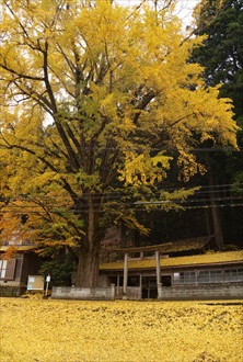 ◆イチョウ 境内にご神木のイチョウの巨木がある。左京区区民の誇りの木に指定されている。市域では最大級という。11月初旬に黄葉、落葉し、一帯が黄色に染まる。高さ35m、幹周5.13m。