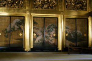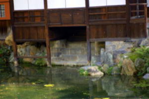 ![]() 虎の間の玄関(国宝) ![]() ![]() ![]() 旧仏飯所 ![]() 大玄関 ![]() 駒繋 ![]() 波の間玄関(国宝) ![]() 波の間玄関、切妻に2羽の鳳凰が彫られている。 ![]() 中央に南能舞台、その背後に対面所・雁の間・菊の間、書院などがある。 ![]() ![]() 「虎渓の庭」 ![]() 「虎渓の庭」 ![]() 「虎渓の庭」、借景として、奥の御影堂屋根を廬山に見立てたという。亀島(中)と鶴島(下)。 ![]() ![]() 北能舞台(国宝) ![]() 北能舞台、鴨川石(なめり石)