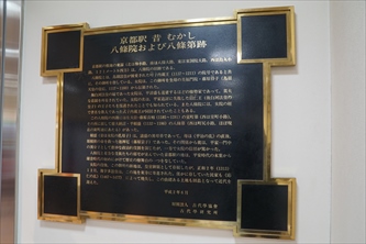 京都駅八条口総合案内所内、西側の壁に「京都駅 昔むかし 八条院および八条第跡」(古代学協会・古代学研究所)の説明板が掲げられている。 八条院(はちじょういん)とは、平安時代の皇女・八条院暲子(しょうし)内親王の院号であり、その御所も意味した。八条第とは、御所の西に隣接していた権大納言・平頼盛の邸宅だった。 御所の八条院は、鎌倉時代後期-室町時代に現在の京都駅東一帯(北は梅小路、南は八条大路、東は東洞院、西は烏丸小路、121m四方)にあった。付近は八条院町(八条女院町、院町)と呼ばれた。現在の下京区東塩小路町、東塩小路釜殿町、東塩小路高倉町になる。 ◆歴史年表 平安時代後期、この地は、藤原顕季(ふじわら-の-あきすえ、1055-1123)、その子・長実(ながざね、1075-1133)に継がれる。 長実の娘・鳥羽天皇中宮・美福門院得子(びふく-もんいん-とくし、1117-1160) は、御所(美福門院御所)を営む。御所は八条通の烏丸-室町間(現在の東塩小路釜殿町、京都駅構内)にあった。 1137年、暲子内親王は美福門院御所に生まれる。 1140年、暲子は、父・鳥羽天皇より所領を譲られる。東は高倉東、西は堀川東、北は八条坊門、南は八条南の範囲(現在の京都駅構内)であり、八条院町と呼ばれた。暲子は、女院御所に暮らした。女院庁、女院御倉などが建てられていた。(「八条女院院町在所安注文」) 1160年、得子が亡くなり、暲子は得子の遺領である八条院を加える。遺領は230カ所以上となる。八条院の西隣には、左大臣・藤原良輔(1185-1218)の室町第(西は室町小路)、西に隣接し権大納言・平頼盛(1131-1186)の八条第(西は町尻小路、現在の新町通)があった。 第78代・二条天皇(在位1158-1165)の時、美福門院御所は里内裏になる。八条院と呼ばれていた。(『百錬抄』) 1181年、白河法皇(第72代)が鳥羽殿での幽閉を解かれ、美福門院御所に移る。北面の武士が御所を警護した。(『平家物語』) 鎌倉時代、1194年、美福門院御所は炎上した。すぐに再建される。(『玉葉』)。御所跡のその後については不明。 鎌倉時代、八条殿には後白河天皇第3皇女・式子内親王(1149-1201) が暮らした。公家・歌人・藤原定家(1162-1241)、その姉になる女房・歌人・健御前(けんごぜん、建春門院中納言、1157-?)も訪れた。後鳥羽上皇(第82代、1180-1239)が行幸している。 1211年、暲子が没し、八条院領は皇族御領として継がれた。御所、周辺も荒廃する。東洞院大路に面した築垣は撤去され、民家、畑も広がった。 13世紀(1201-1300)後半-14世紀(1301-1400)、職人町の八条院町は、最盛期を迎えた。 1313年、後宇多法皇(第91代)は、八条院領の八条院御所跡中心、院町13カ所を東寺に寄進した。以後、東寺領八条院町になる。以来、公家久我(こが)家領などによる領地の相論が続いた。八条院町では、学衆(がくしゅ)が管轄し、年貢徴収の実務は、所務(しょむ) 、給主(きゅうしゅ)、さらに末端の散所(さんじょ)が担った。 14世紀(1301-1400)後半、八条院町は衰退した。 室町時代、応仁・文明の乱(1467-1477)により、焼失し、田畑になる。 近世(安土・桃山時代-江戸時代)、葛野郡東塩小路村になり、畑地が広がる。 近代、1876年、大宮通仮停車場(現在の京都貨物駅付近) -向日町駅間の官設鉄道が仮開業した。 現代、1994年、京都駅ビル改築時の発掘調査により、鎌倉時代の刀装具鋳型、室町時代の鋳造関係遺構が発見された。 ◆美福門院 平安時代後期の第74代・鳥羽天皇の皇后・美福門院(びふく-もんいん、1117-1160) 。得子(とくし)、法名は真性定。父は藤原長実(ながざね)、母は源俊房(としふさ)の娘・方子。鳥羽天皇は皇后・待賢門院(たいけんもんいん)と不和で、高陽(かや)院を皇后とした。美貌の得子も寵愛し入内させる。1139年、女御となり、皇子・体仁(なりひと)親王(第76代・近衛天皇)が生まれた。得子は、生後3カ月の親王を第75代・崇徳天皇の皇太子とし、鳥羽法皇を説き崇徳天皇退位を強いた。1141年、3歳で近衛天皇は即位する。准三宮宣下、皇后として権勢も高まる。1149年、美福門院の院号宣下。1155年、近衛天皇没後、崇徳上皇の皇子・重仁親王を退け、第77代・後白河天皇を擁立し、1156年、保元の乱の要因になる。同年、鳥羽法皇の没後、落飾し真性定と称した。白河の金剛勝院(押小路殿)に住した。44歳。 墓は高野山陵(和歌山県伊都郡)。 美福門院御所は、八条通の烏丸-室町間(現在の東塩小路釜殿町、京都駅構内)にあった。 ◆八条院 平安時代後期-鎌倉時代前期の女院・八条院(はちじょういん、1137-1211)。暲子(しょうし)内親王、法名は金剛観。第74代・鳥羽天皇の第3皇女。母は藤原長実の娘・美福門院得子(びふくもんいん-とくし)。美福門院御所に生まれた。山荘、常盤殿を営む。1138年、内親王、1146年、准三宮。1155年、中継ぎの同母弟の第76代・近衛天皇の死後、鳥羽天皇は暲子を女帝に立てようとしたが実現しなかった。1157年、出家し法名は金剛観と称した。1161年、第78代・二条天皇の准母として院号宣下、八条院と称した。后位を経ずに院号を得た初例になる。八条