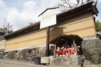 北中院町(きた-ちゅういん-ちょう)の通り沿いに、地蔵尊が祀られている。その傍に、「中院山荘跡(ちゅういんちょう-さんそう-あと)」と書かれた駒札だけが立てられている。 かつて付近には、鎌倉時代の僧・蓮生(宇都宮蓮生)の営んだ「中院山荘」があったという。このため、「小倉百人一首ゆかりの地」ともいわれている。 ◆歴史年表 平安時代末、すでに中院の地名が用いられていたとみられる。 鎌倉時代初期、この付近に、僧・蓮生(1178-1259)の「中院山荘」があったという。 1235年、蓮生は、自らの中院山荘(小倉山荘ではない)の障子に貼る色紙和歌の選定、執筆を藤原定家(1162-1224)に依頼した。(『明月記』)。中院山荘近くの小倉山麓には、定家の山荘があり、二人には親交があった。 江戸時代、1711年、中院は清凉寺西、香厳院東にあった。天台系真言宗の寺院であり、愛宕山の白雲寺の末院だった。 (『山城名勝志』『山州名跡志』) 1734年、中院町と記されている。町名の初見になる。 (『山州名跡巡行志』) ◆宇都宮 蓮生 平安時代後期-鎌倉時代前期の武将・宇都宮 蓮生(うつのみや-れんしょう、 1172/1178-1259)。男性。頼綱、通称は弥三郎、実信房、法名は蓮生、宇都宮入道、小倉入道、宇都宮検校など。父・宇都宮成綱、北条時政の女婿。宇都宮5代城主、鎌倉幕府御家人になる。1194年、祖父・朝綱の公田掠領の罪に連座し配流される。まもなく許された。1205年、平賀朝雅の将軍擁立という北条時政の陰謀事件に関連して疑いをかけられた。下野で出家し、宇都宮蓮生と称した。この時、郎党60余人も出家した。摂津箕面・勝尾寺で法然に会う。弟・信生(塩谷朝業)と共に法然の弟子になる。1212年、法然没後はその高弟・証空に師事し、西山往生院の復興を行う。1227年、天台衆徒より法然遺骸を護った一人になる。藤原定家より歌を学び、定家の子息・為家に娘を嫁がせた。二尊院近くの小倉山麓に「中院山荘」を構える。1235年、山荘障子に貼る色紙の執筆を定家に依頼し、定家は天智天皇以来の一首ずつを綴り、「小倉百人一首」の原型になる。1257年、三鈷寺で不断念仏を始める。西山上人13回忌の準備途中で亡くなる。『新勅撰集』以下の勅撰集に入集している。88歳。 遺言により、西山上人石塔の横に蓮生の石塔を建てて供養した。現在、三鈷寺・華台廟に西山上人と共に祀られている。 ◆小倉百人一首 鎌倉時代中期、1235年、蓮生は自らの山荘の障子に貼る色紙和歌の選定、執筆を定家(1162-1241)に依頼した。定家は『百人秀歌』を編した。『古今集』以下の勅撰集より選び、色紙に第38代・天智天皇以来の名歌人の作を書いたという。定家晩年のことという。「小倉百人一首」「小倉山荘色紙形和歌(小倉山荘色紙和歌)」とも呼ばれる。 「小倉百人一首」は後世、第74代・鳥羽天皇、第84代・順徳天皇の歌を加え、補訂されたという。ただ、異説もある。 江戸時代初期以後は、「歌がるた」として愛好された。近代以降、「競技かるた」として発展した。 ◆中院 中院は天台系真言宗の寺院であり、愛宕山の白雲寺の末院だった。山上に上院、下院は京の大仏殿付近にあったという。愛宕詣りの宿坊ともいう。 *年号は原則として西暦を、近代以前の月日は旧暦を使用しています。 *参考文献・資料 駒札、『京都大事典』、ウェブサイト「コトバンク」 ![]() ![]() ![]() ![]() ![]() ![]() ![]() ![]() ![]() ![]() |