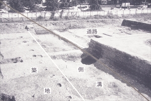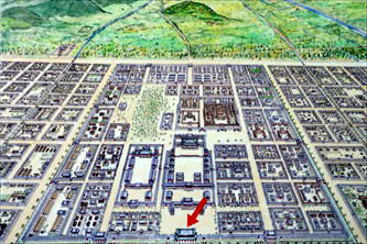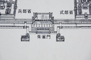 ![]() 「此附近平安京大内裏朱雀門址」の石標 ![]() ![]() 【参照】中央下に鳥羽の作り道、その先に平安京の朱雀大路、「平安宮-京都市建設局・京都市埋蔵文化財調査センター・京都市埋蔵文化財研究所」説明板(二条駅前)より ![]() 大内裏の朱雀門(赤い矢印)、京都市考古資料館の説明板より ![]() 【参照】大内裏復元模型、中央に朱雀大路、その突き当りに朱雀門、その奥に朝堂院がある。(京都市平安京創生館、展示模型より) ![]() 朱雀門は赤い囲み部分、その上に朝堂院、京都市考古資料館の説明板より ![]() ![]() ![]() ![]() 【参照】右京職の一部築地(左)と朱雀大路の側溝(中央)、「平安宮-京都市建設局・京都市埋蔵文化財調査センター・京都市埋蔵文化財研究所」説明板(二条駅前)より) |