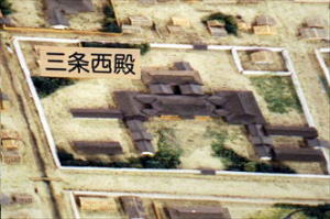 ![]() 「三条西殿跡・三条大路跡」の説明板、財團法人古代學協會 ![]() 【参照】平安時代の三条西殿の復元図(京都市平安京創生館、展示パネルより) |